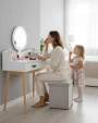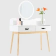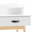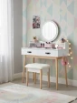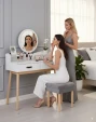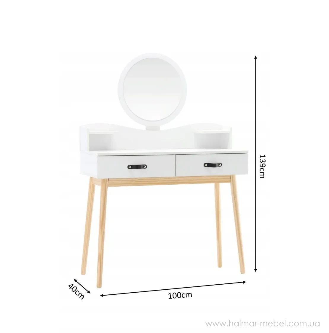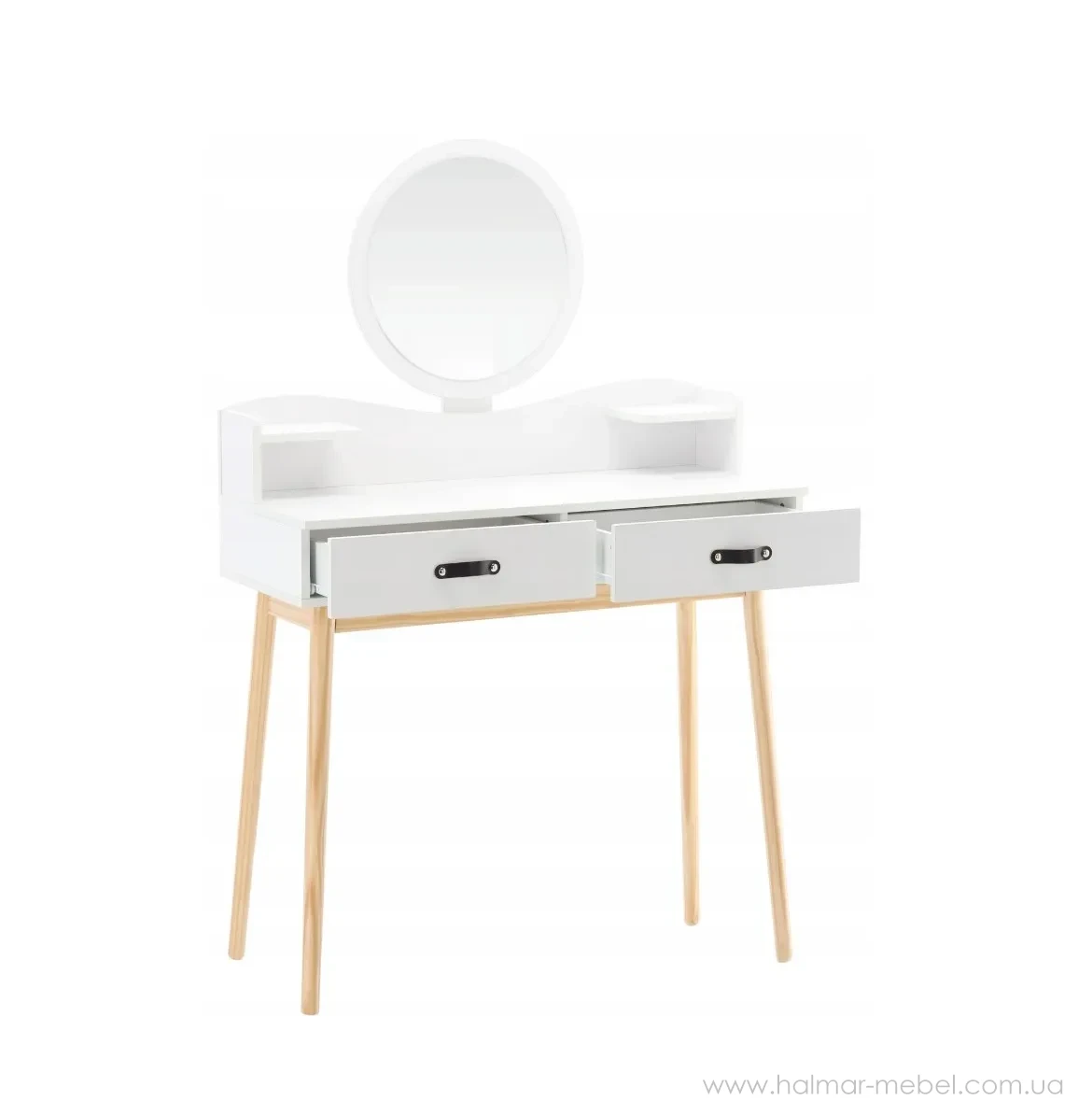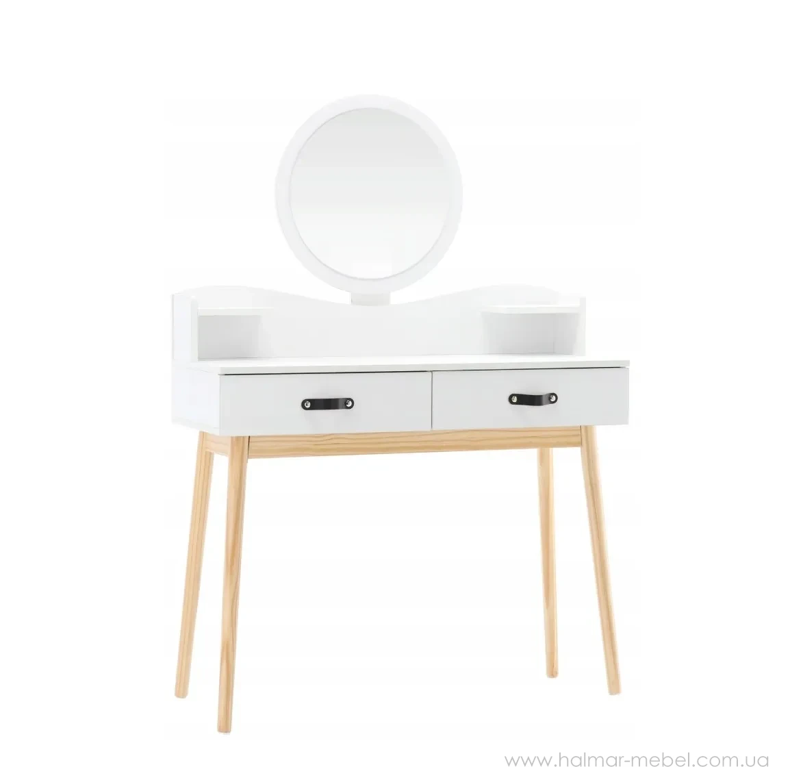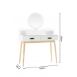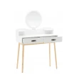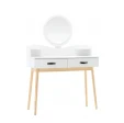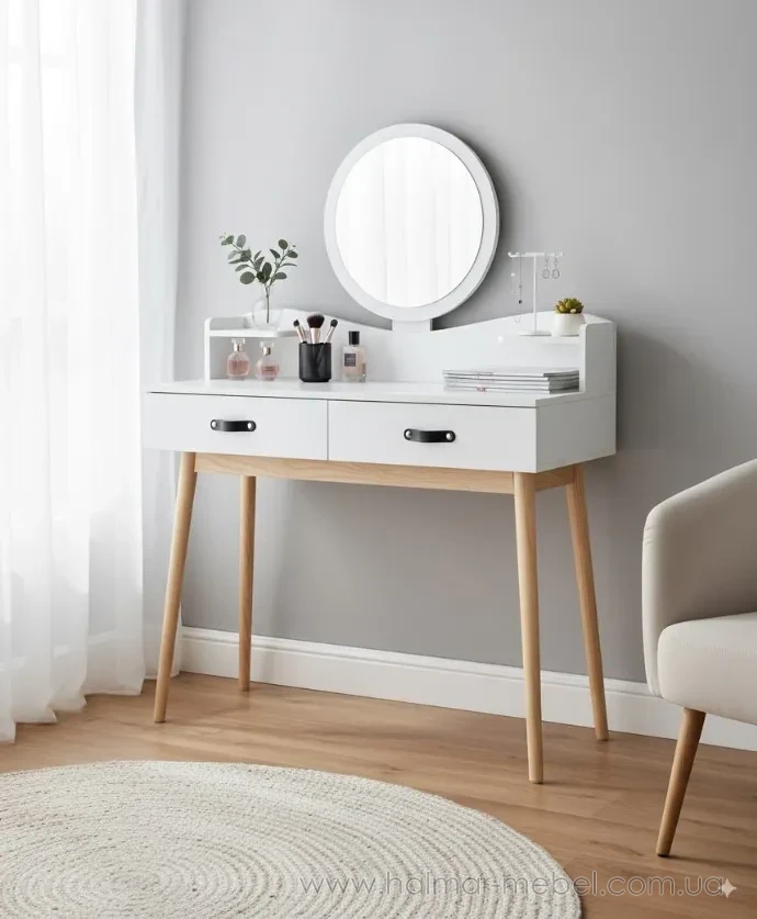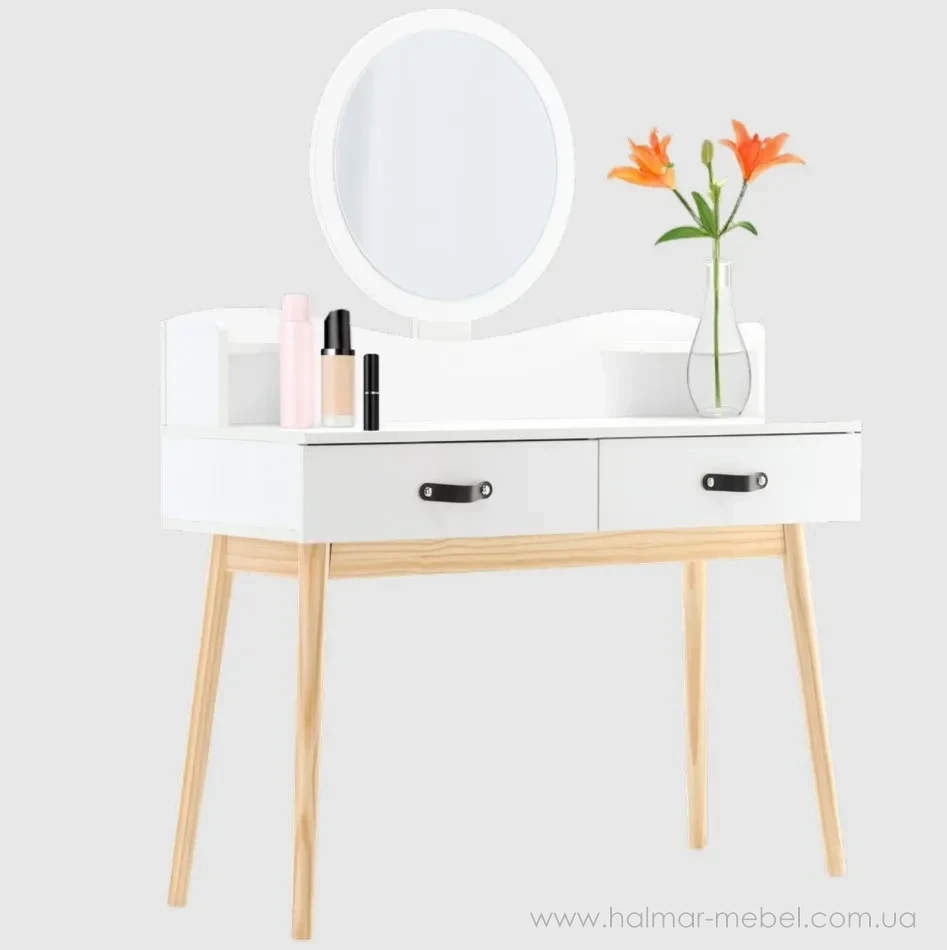 Туалетний стіл із дзеркалом CHOMIK - привабливий комплект у скандинавському стилі для спальні або вбиральні. Він вдало поєднує цікавий дизайн, надійність і функціональність. Конструкція туалетки включає в себе кругле дзеркало, яке полегшує щоденний макіяж і догляд за шкірою, 2 висувних шухлядки ідеально підходять для косметики, прикрас та аксесуарів, забезпечуючи порядок та організацію, полички біля дзеркала – додаткове місце для корисних дрібниць та декору.