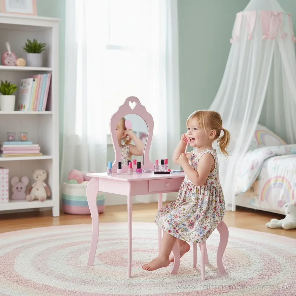 Туалетний стіл дитячий з дзеркалом і табуретом CHOMIK рожевий - елегантна новинка для наших маленьких користувачів. Цей комплект - пропозиція ТМ Chomik, яка поєднує стильний дизайн, надійність, функціональність і стане ідеальним доповненням в кімнаті дитини або дошкільному центрі. Туалетний столик це зручне місце для щоденних процедур догляду, а також місце для сюжетно-рольових ігор. А ще це дуже добрий подарунок!