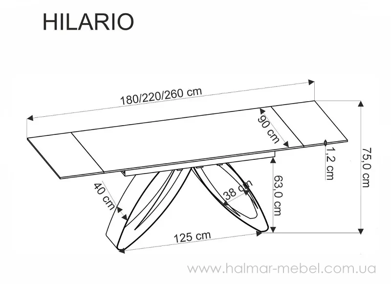 Обідній стіл розсувний HILARIO HALMAR – приваблива новинка 2024 року для сучасної обідньої зони. Конструкція столу складається із сталевого каркасу та прямокутної стільниці з ефектом чорного мармуру. У розкладеному положенні довжина стільниці становить 260 см.