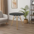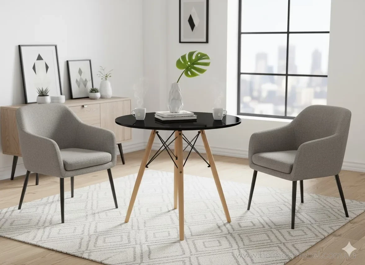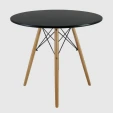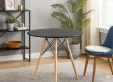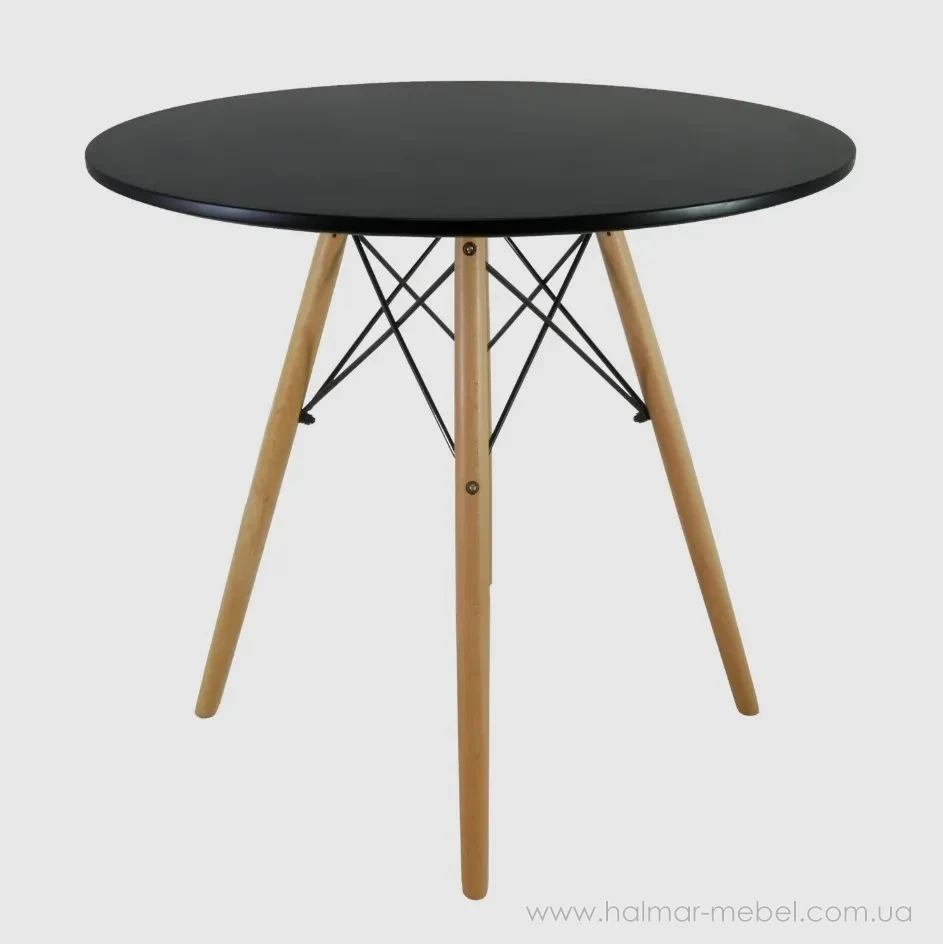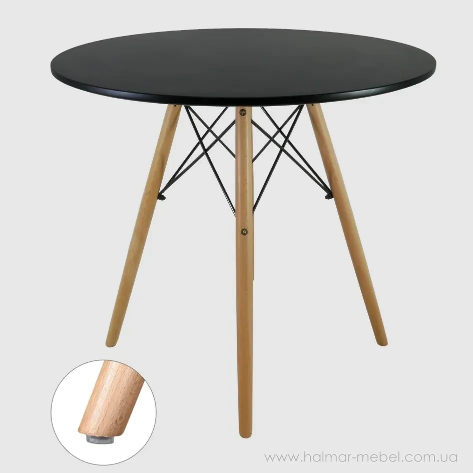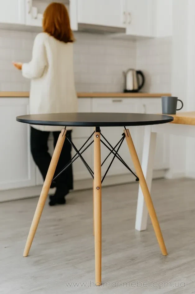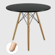 Стіл обідній круглий CHOMIK чорний/натуральний - приваблива та практична модель для невеликої кухні, а також кафе чи офісу. Стіл включає круглу стільницю з МДФ і дерев'яні ніжки, а додаткові металеві елементи посилюють конструкцію та надають їй сучасний вигляд. Поверхні столу не вимогливі догляду, легко очищаються від забруднень і будуть служити довго.