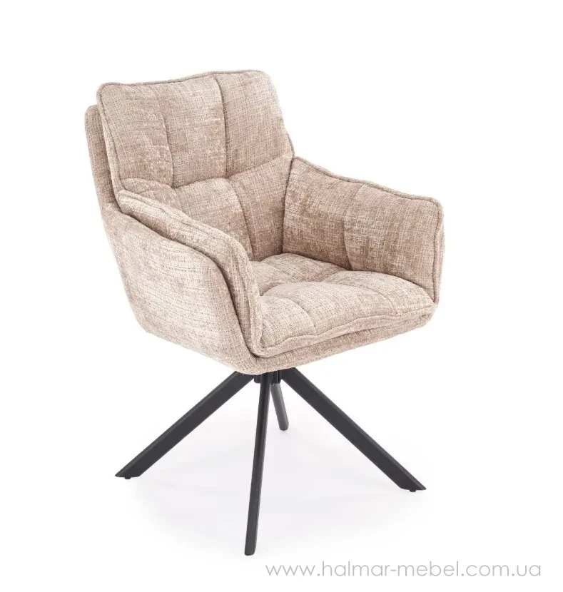 Крісло поворотне K597 HALMAR бежевий - приваблива новинка для сучасного інтер'єру. Його конструкція складається з чорного сталевого каркасу та м'якого сидіння зі спинкою і підлокітниками. Функціональною особливістю моделі є поворотний механізм. Як оббивка використана тканина Cremona бежевого кольору.