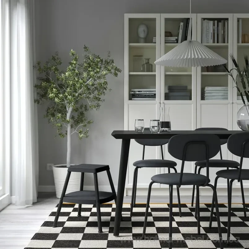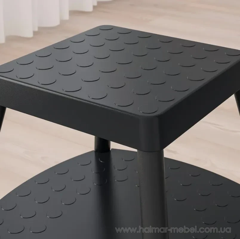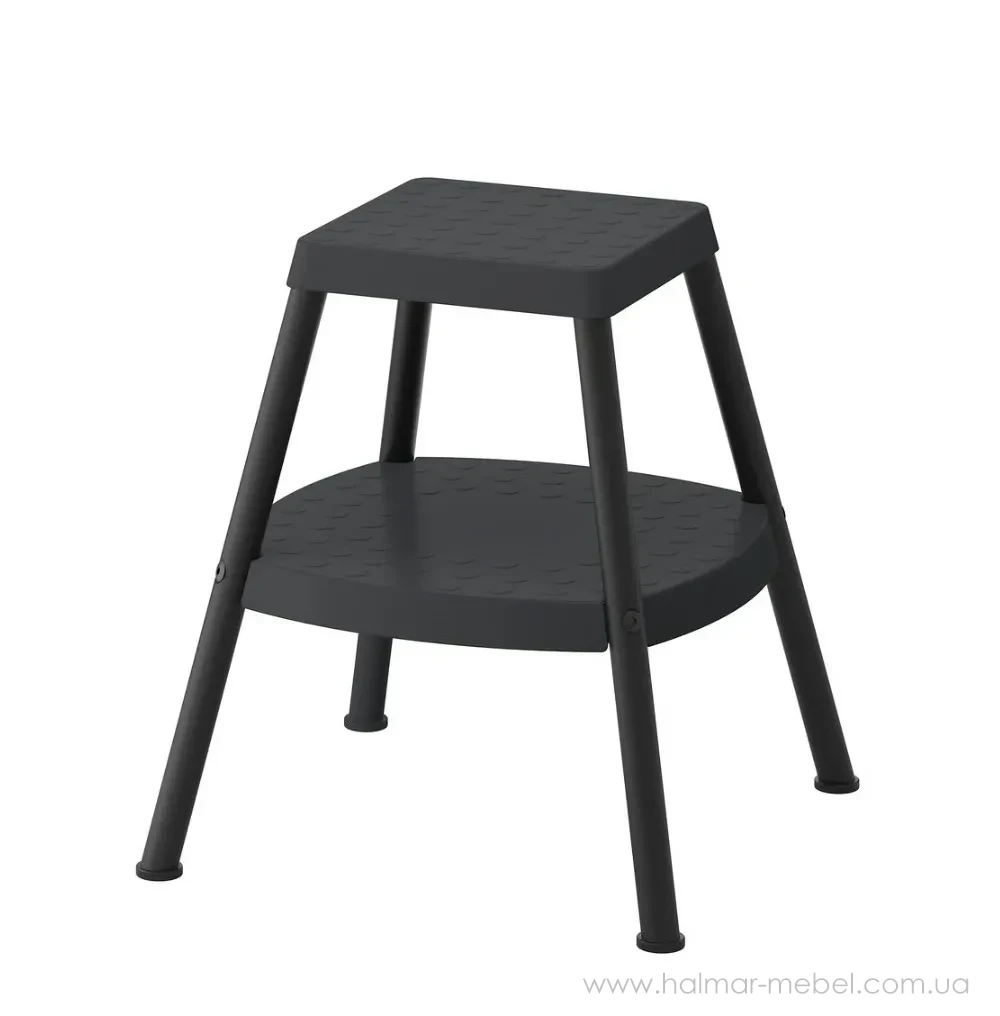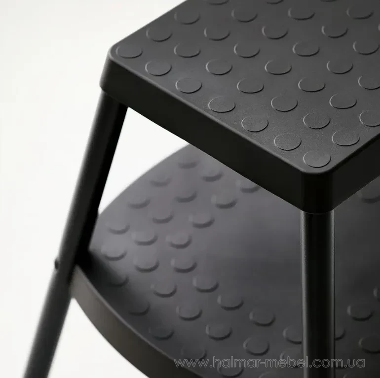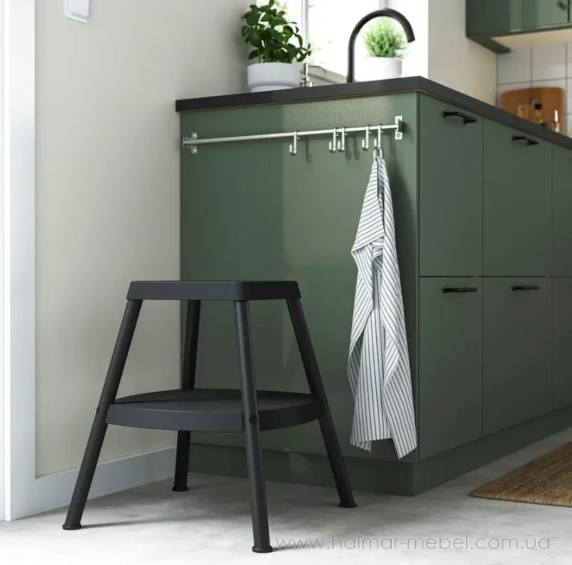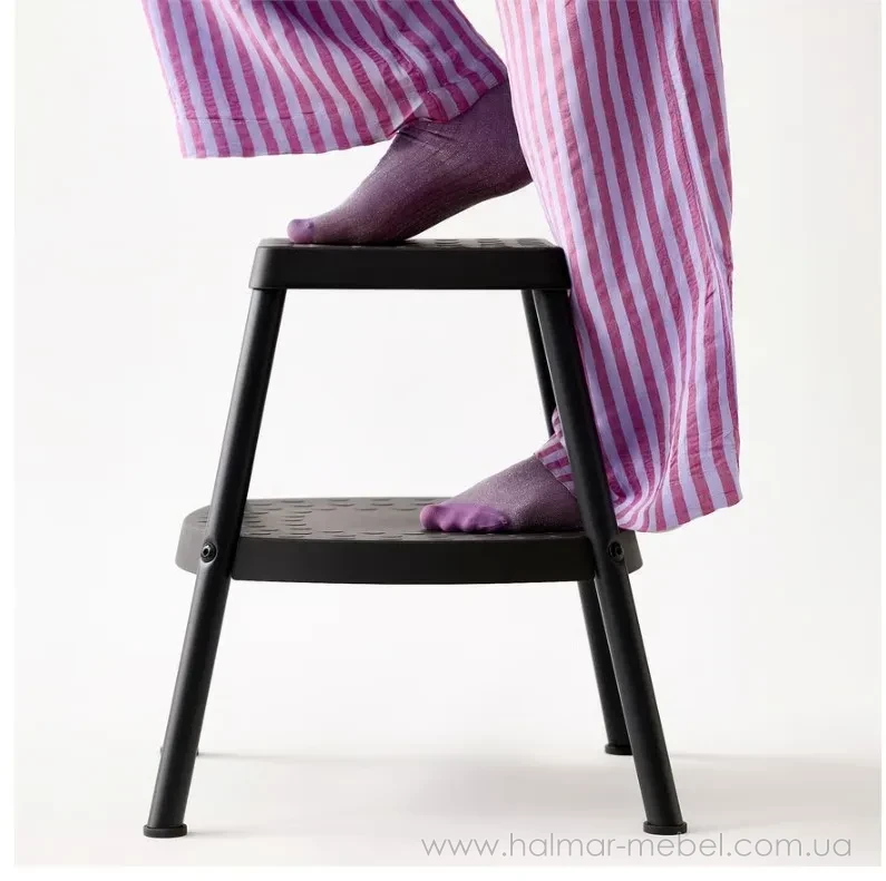 Табурет зі сходинкою HADDARP IKEA чорний - практичний та надійний предмет меблів, який можна використовувати для сидіння, а також як пристосування для полегшення домашніх справ. Конструкція табурету складається із сталевого каркасу та двох сходинок із поліпропілену.