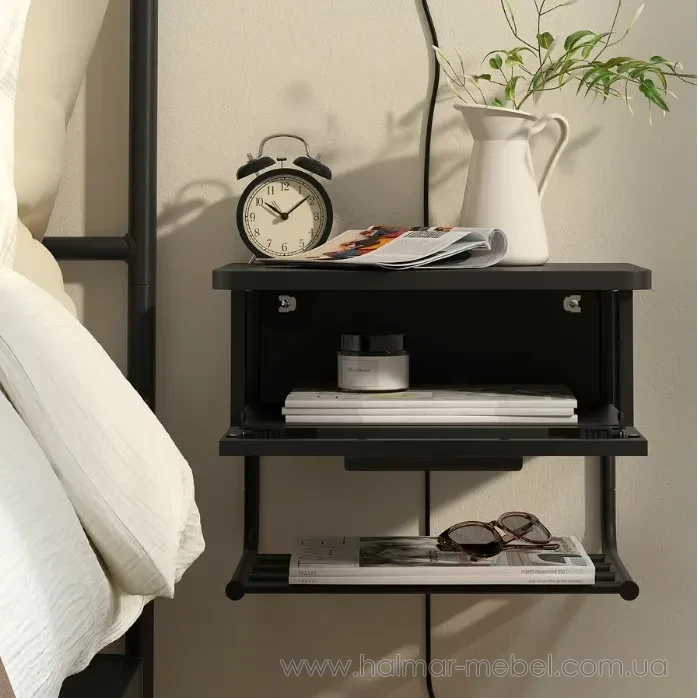 Столик настінний GRÅFJÄLLET IKEA антрацит - стильна новинка для інтер'єру спальні. Її конструкція включає сталевий каркас, полицю та корпус з відкидною кришкою.