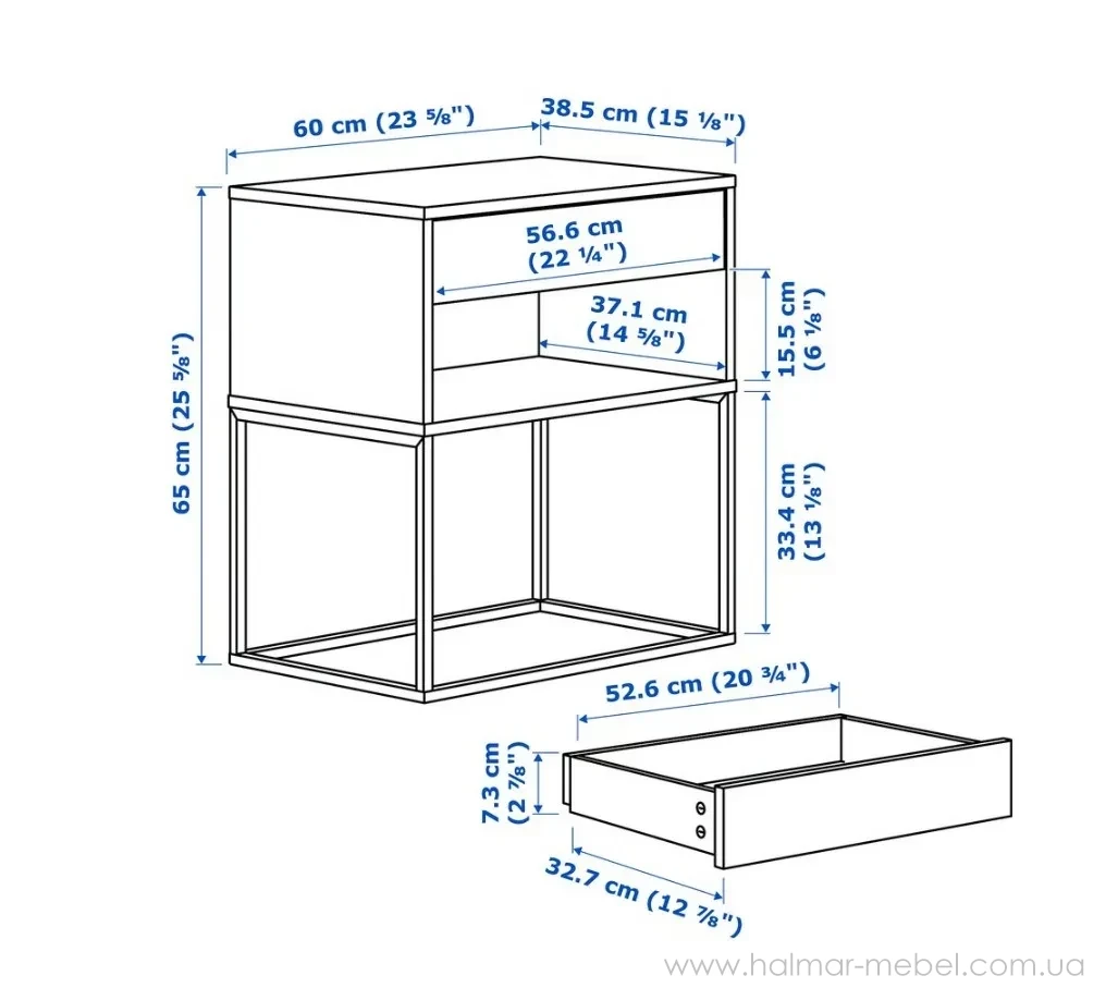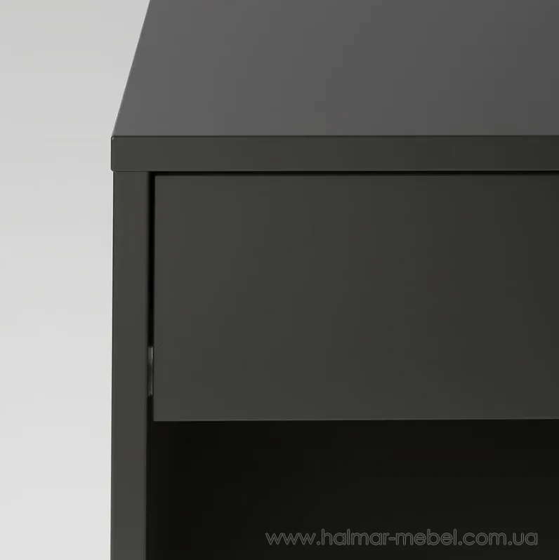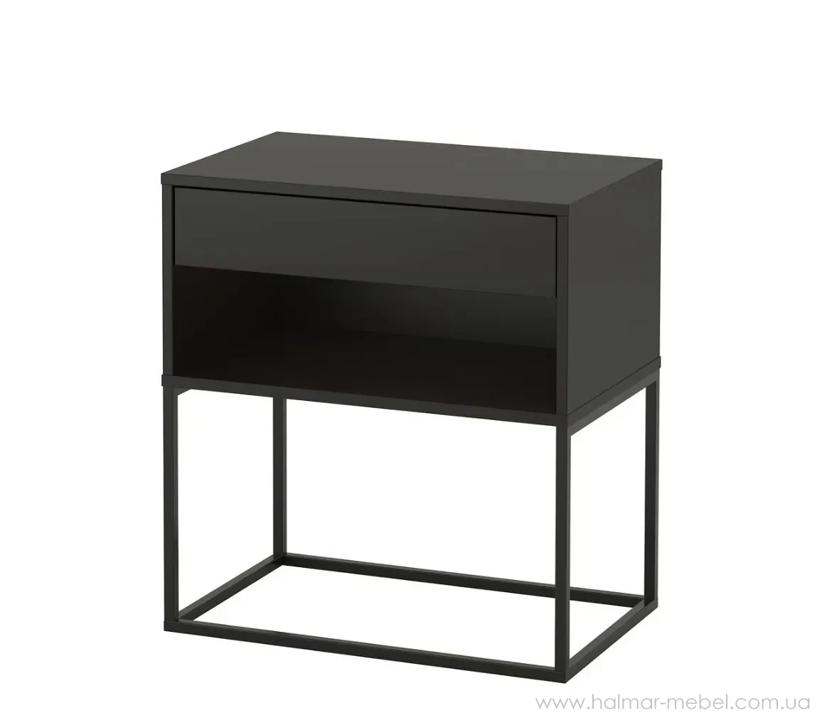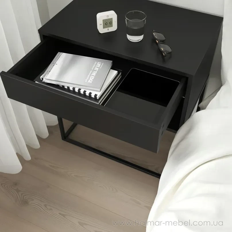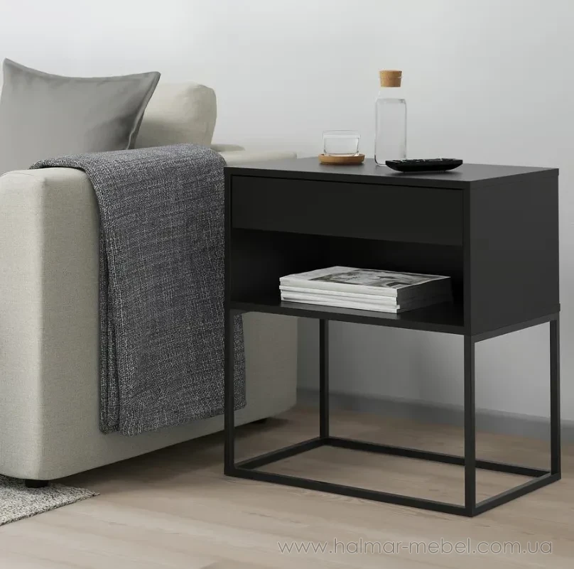 Тумба приліжкова VIKHAMMER IKEA чорна - лаконічна та практична модель в стилі лофт. Конструкція тумби складається зі сталевого каркаса і корпусу, всередині якого знаходиться відкрита ніша і висувна шухляда. Вбудована функція тихого закривання забезпечує м'який і безшумний рух шухляди.