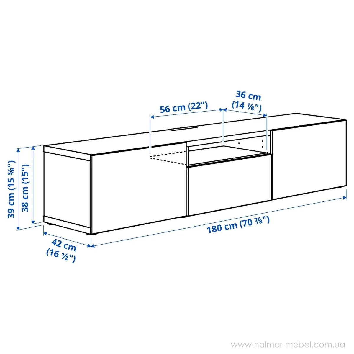 Тумба під телевізор BESTÅ IKEA - приваблива пропозиція для сучасної вітальні. Ідеально підходить для телевізорів із діагоналлю до 72 дюймів. Конструкція тумби складається з корпусу з 2-а закритими відділеннями, висувної шухлядки та відкритої ніші. Тумбу можна встановити на підлогу або закріпити на стіні. Технічні отвори в задній стінці допомогають приховати кабелі телевізора та інших пристроїв. Фасади відкриваються за допомогою ручок, які можна придбати окремо. Запропонований асортимент кольорових версій дозволяє вибрати кращій варіант для вашого інтер'єру.