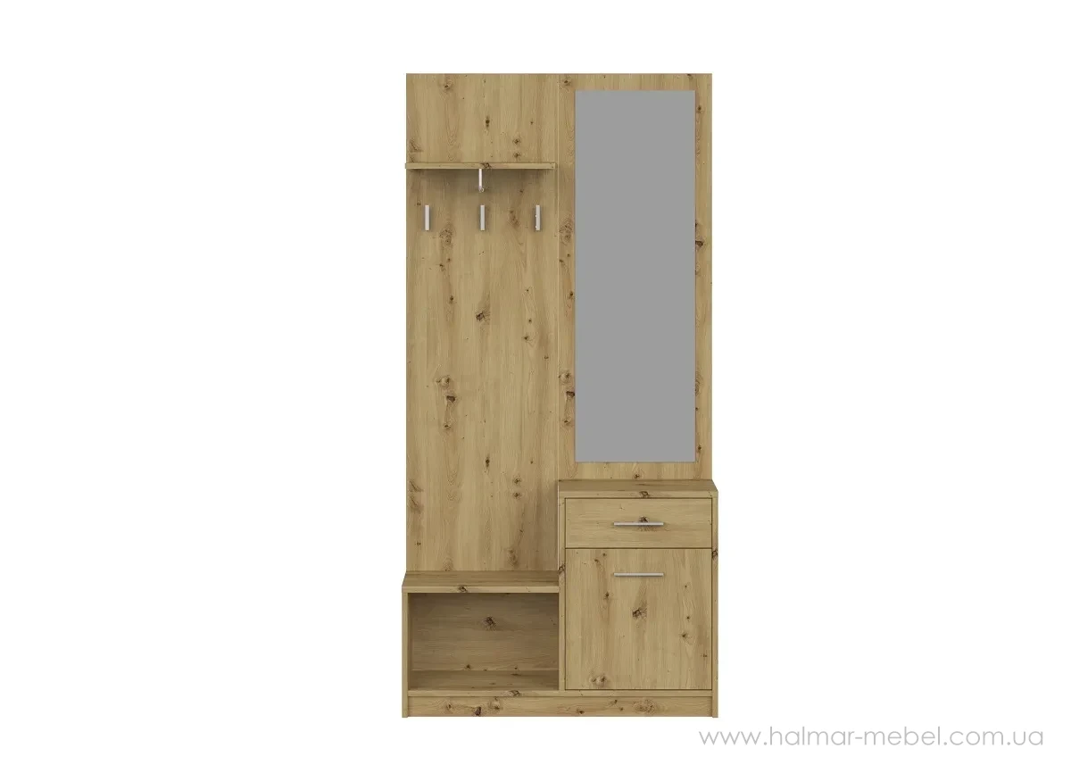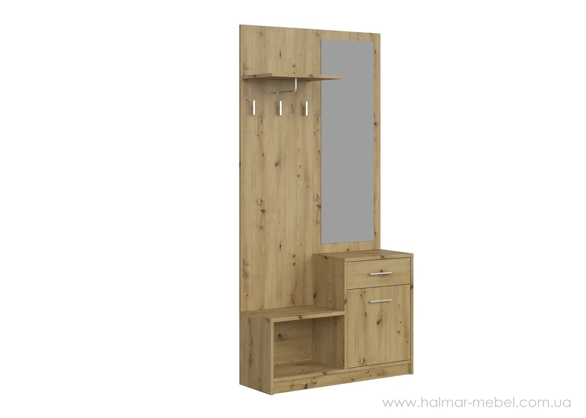 Передпокій PERGO HALMAR дуб артизан – компактна функціональна новинка для невеликої передпокою. Її конструкція виготовлена з ламінованої ДСП і включає: відкриту вішалку для верхнього одягу, полицю для головних уборів та інших аксесуарів, відкриту тумбу для взуття, дзеркало, тумбу з дверцятами та висувною шухлядою.
